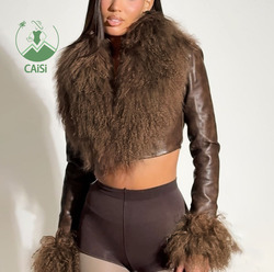 नई महिलाओं के विंटेज फर कॉलर जैकेट कोट फैशन फर पैचवर्क लंबी आस्तीन v-गर्दन pu चमड़े के छोटे जैकेट