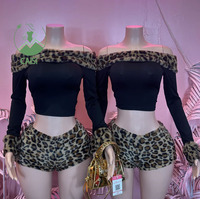 Sexy Leopard Print Fur Patchwork 2 Pieces Set Off Shoulder Backless Crop Top and Shorts Female Streetwear Wome'ns Outfits