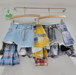 Saia Mini Irregular em Jeans com Estampa Xadrez para Mulheres, Moda 2026, Saias de Jeans Femininas